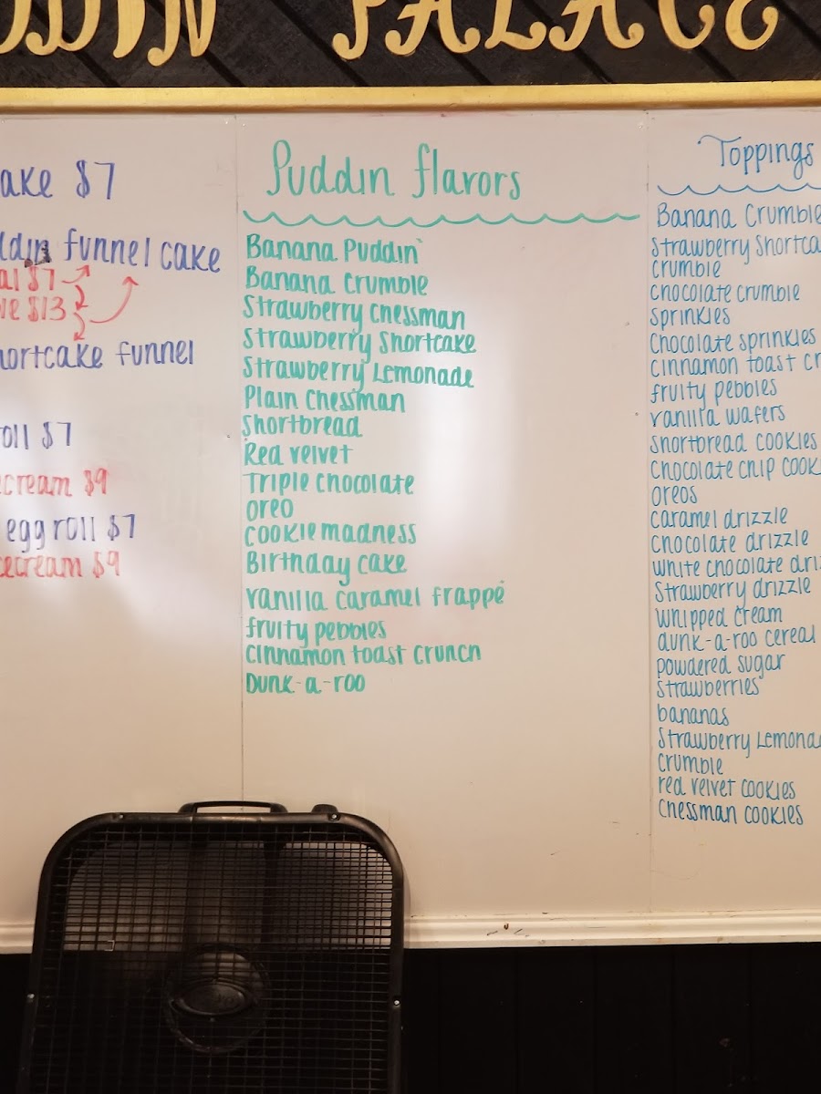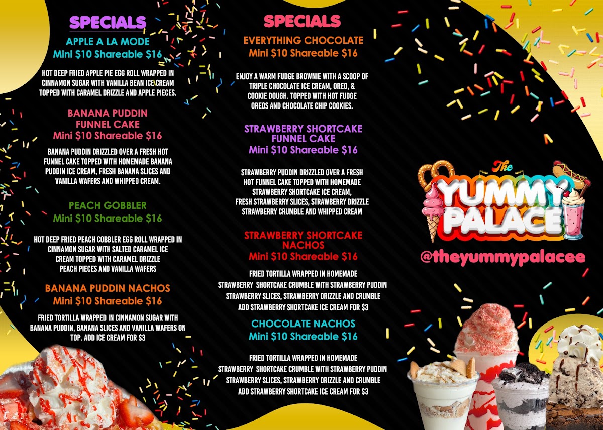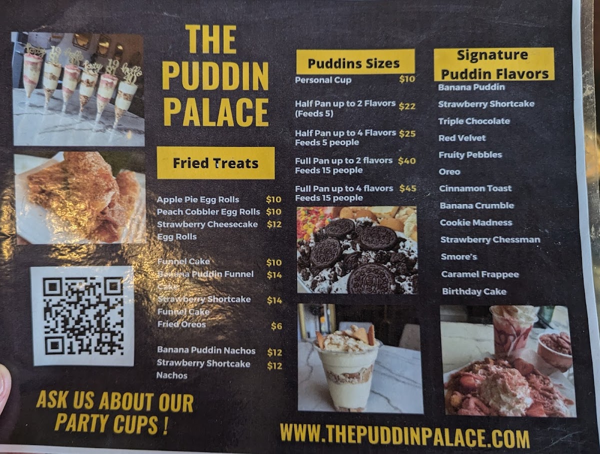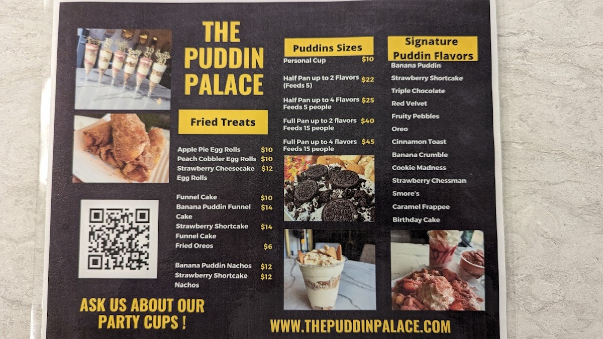The Puddin Palace offers a delightful array of sweet and savory treats that cater to every craving. For dessert lovers, the cheesecakes are a must-try, with flavors like Oreo Cheesecake and Cinnamon Toast Crunch Cheesecake, priced at $5.99 each. If cookies are more your style, indulge in the Large Chocolate Chip Cookie or the Banana Puddin Cookie for just $2.99. Cupcake fans can enjoy options like the Strawberry Shortcake Cupcake and the Chocolate Delight, each priced at $3.99. The menu also includes indulgent Slammers, such as the Strawberry Shortcake Slice and Oreo Slammer, priced around $3.99. For a refreshing drink, try the Cinnamon Toast Crunch Milkshake or the Banana Puddin Milkshake, both at $5.99. If you're looking for something unique, the Signature Puddings like Strawberry Lemonade Puddin and Egg Nog provide a special twist, priced at $4.99. The fried desserts are another hit, with options like Fried Oreos and Apple Pie Egg Roll. On Soul Food Fridays, guests can savor dishes like Fried Catfish and Braised Oxtail. The Tacos Tuesday & Thursday feature delicious choices like Jerk Chicken Birria Tacos and Beef Birria, priced at $4.99 each. For a hearty start to the day, the Breakfast At The Palace menu offers dishes like 3 Pancakes or Waffles with 1 Meat and 1 Side for $9.99. Whether you're craving something sweet, savory, or both, The Puddin Palace delivers a memorable and delicious experience for all tastes.